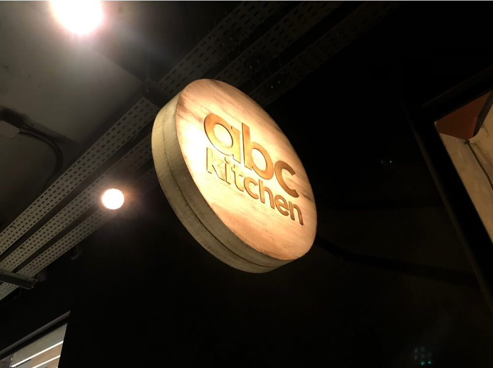 Изготавливается из композитных панелей с прорезями под инкрустацию из оргстекла. Подсветка — двусторонняя.