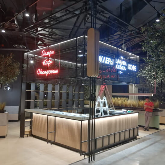 Индивидуальные решения с нестандартными формами, материалами и подсветкой. Подходят для премиальных брендов и объектов с уникальным дизайном. Часто включают авторские элементы и сложные конструкции.