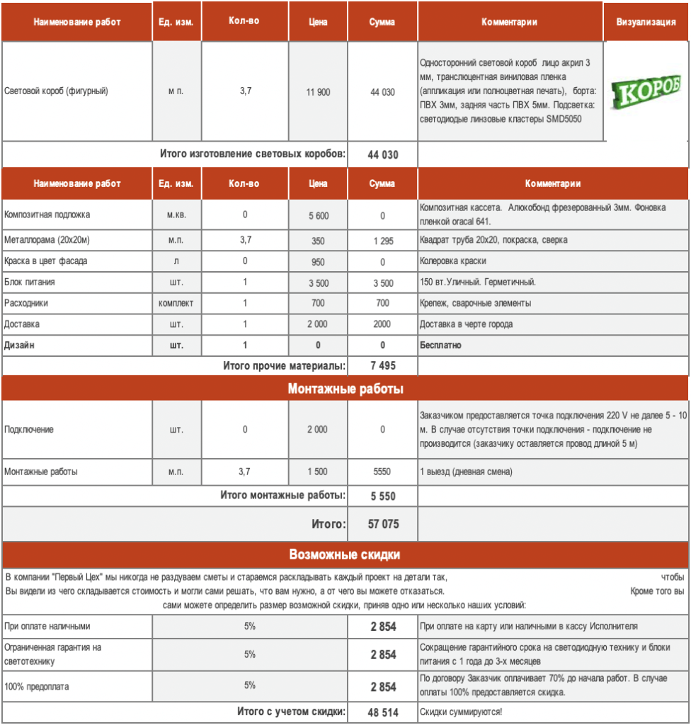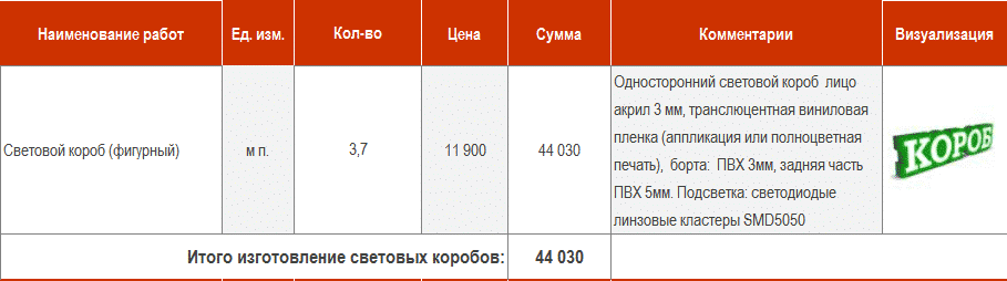 Смета на световой короб