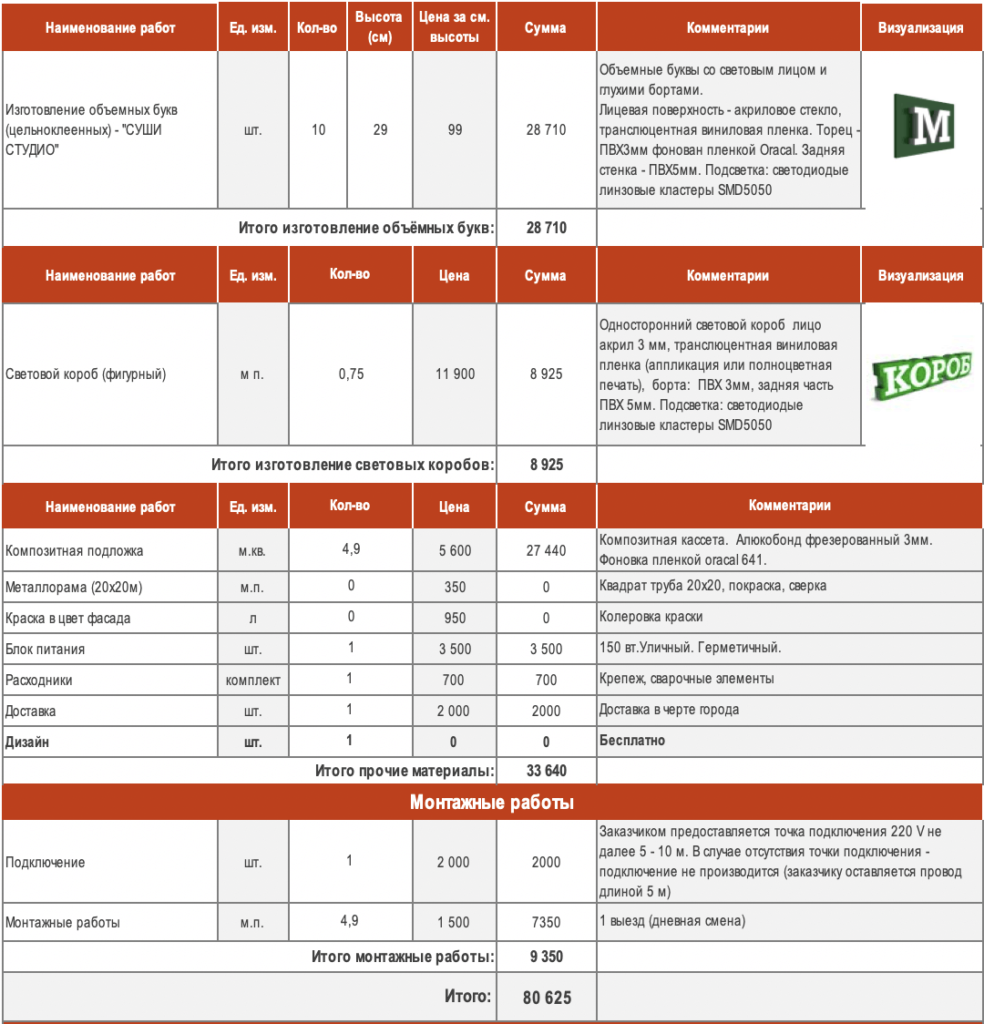 Вот полная смета — 80 625 рублей за объемные буквы.